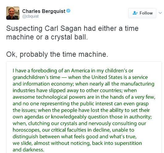 Clicking through the book we find the quote is accurate. More importantly, we find the surrounding context and find that this quote is not being taken out of context. Sagan was truly worried about this issue. His prediction was very much that a sound bite obsessed media, combined with a sort of celebration of ignorance, would drag us backwards. He understood that the world was becoming more difficult while the communication of ideas was simultaneously becoming more shallow.